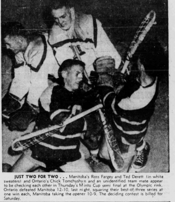 Putting aside Manitoba's disadvantage under the old draw rules, the difference in the penalty filled game was the goal tending of Porky Russell- every time the Manitobans gained momentum and started to close the gap, Russell would hold the fort until Ontario could again pad their lead.